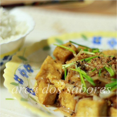 Corto o tofu em pequenos quadrados e vou fritá-los em óleo bem quente até ficarem dourados.